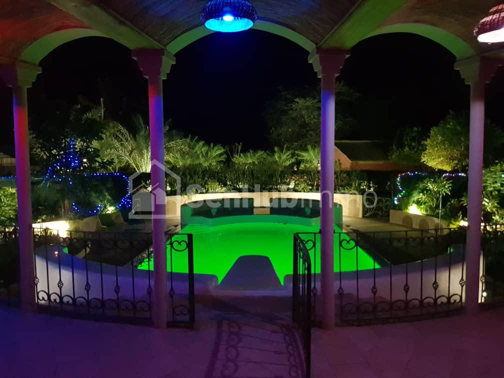 Loggia, Séjour avec mezzanine, Cuisine séparée, aménagée, 5 chambres avec salle de bain, salle à manger, salle télé 2 WC séparés, Piscine avec jacuzzi et vestiaire, Eau chaude : 2 Cumulus électriques, 1 chauffe-eau solaire Terrasse, jardin,restaurant, Garage privé...